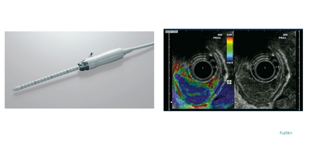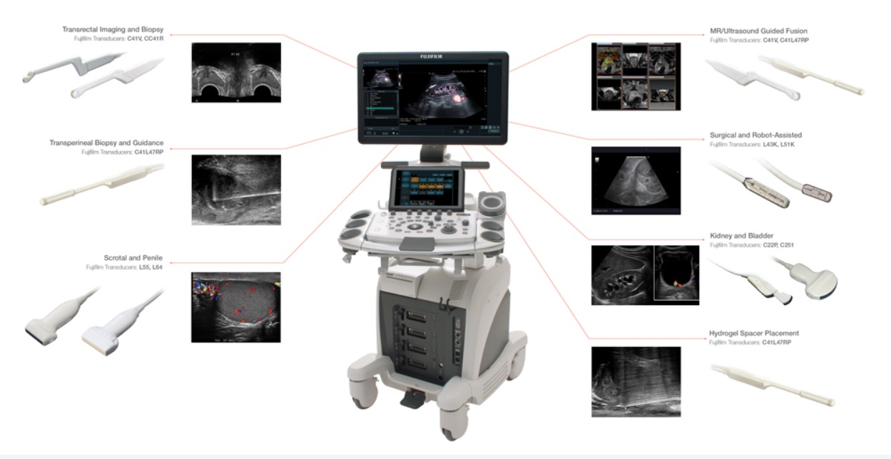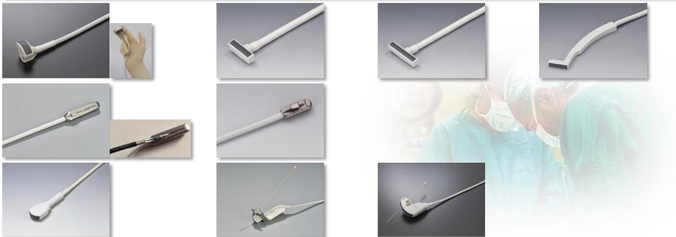 Transductores intraoperatorios Fujifilm, Versatilidad en diversidad y formas de los transductores únicas en el mercado que se pueden utilizar en diferentes tipos de aplicaciones. Fáciles de operar en sitios quirúrgicos pequeños, se preparan por aplicación, un transductor convexo sujeto entre los dedos del usuario y un transductor laparoscópico sujeto con pinzas.